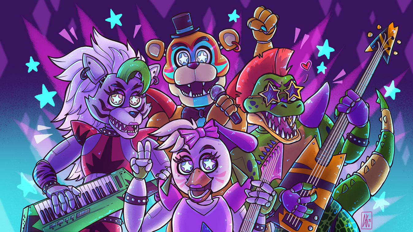 Drawing of Glamrock Freddy, Glamrock Chica, Roxy the Wolf and Montgomery Gator from Five Nights at Freddy's: Security Breach!