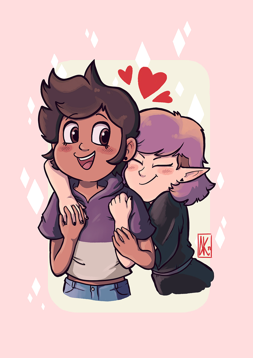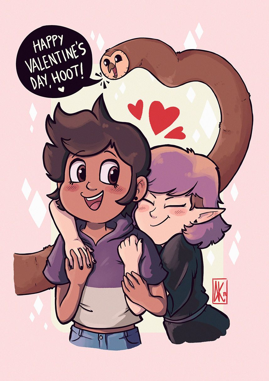 Digital illustration featuring Luz, Amity (and Hooty!) from The Owl House celebrating Valentine's Day!