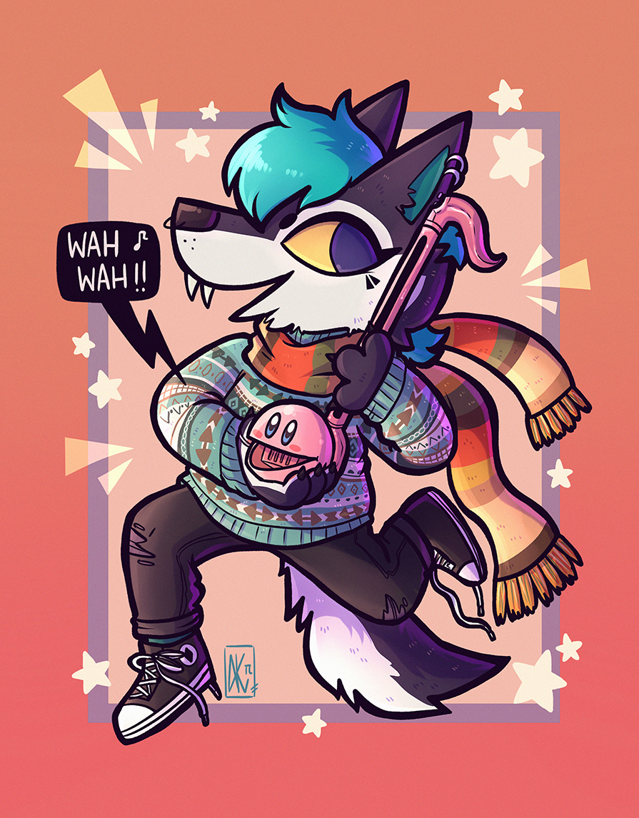 Digital illustration featuring my sona Juniper playing some music with the Kirby Otamatone!